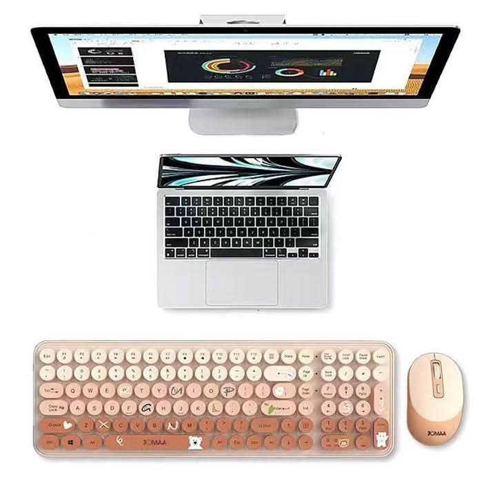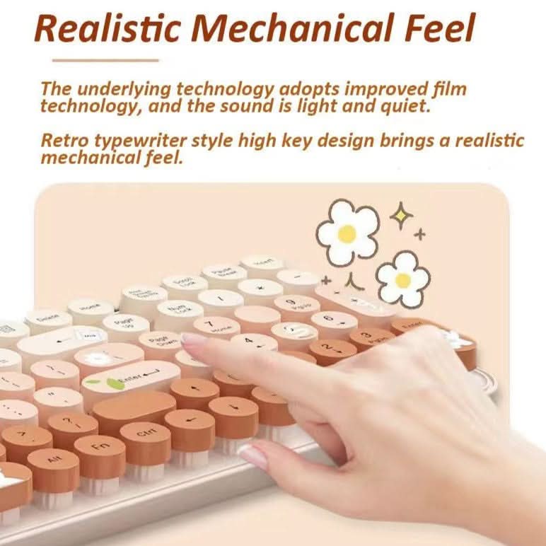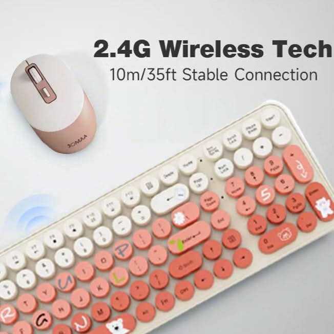 Elevate your workspace with a touch of whimsy and a splash of colour. This wireless desktop set combines a vintage typewriter aesthetic with modern functionality, featuring tactile rounded "pop-keys" and adorable hand-drawn character accents.